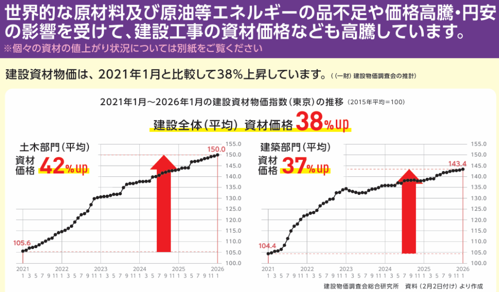 建設業界の資料でも、資材価格:約38%上昇、工事費全体:約30%前後上昇とされています。